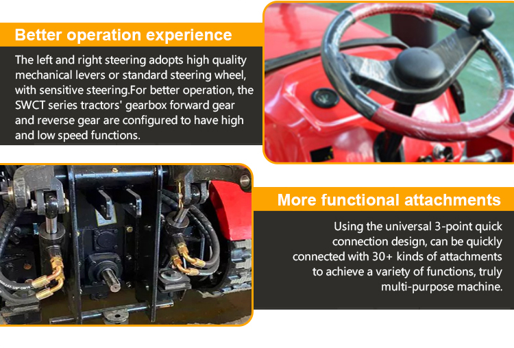 The SWCT series crawler tractor rotary cultivator has the characteristics of multiple functions, and wide adaptability. It is ideal for both dry land and paddy field. Adding more optional attachments to enable you to efficiently complete various small-scale projects:garden, farmland, vegetable greenhouse, digging trench,Irrigation installation and drainage projects.