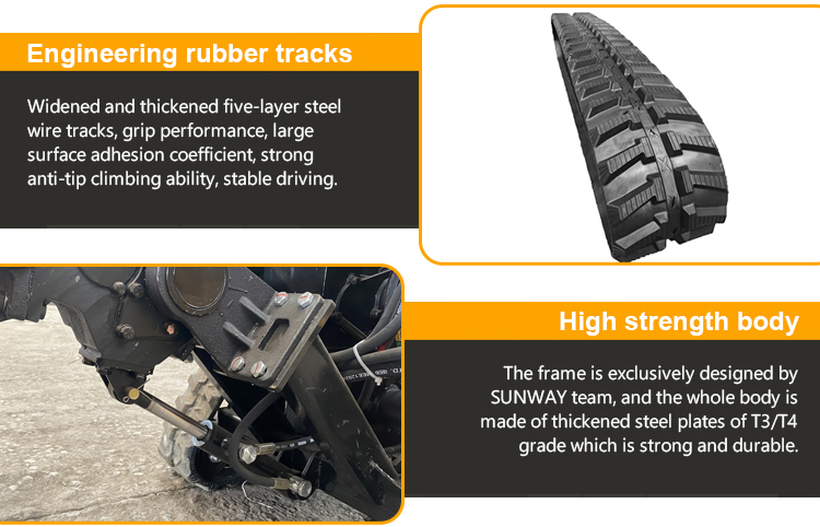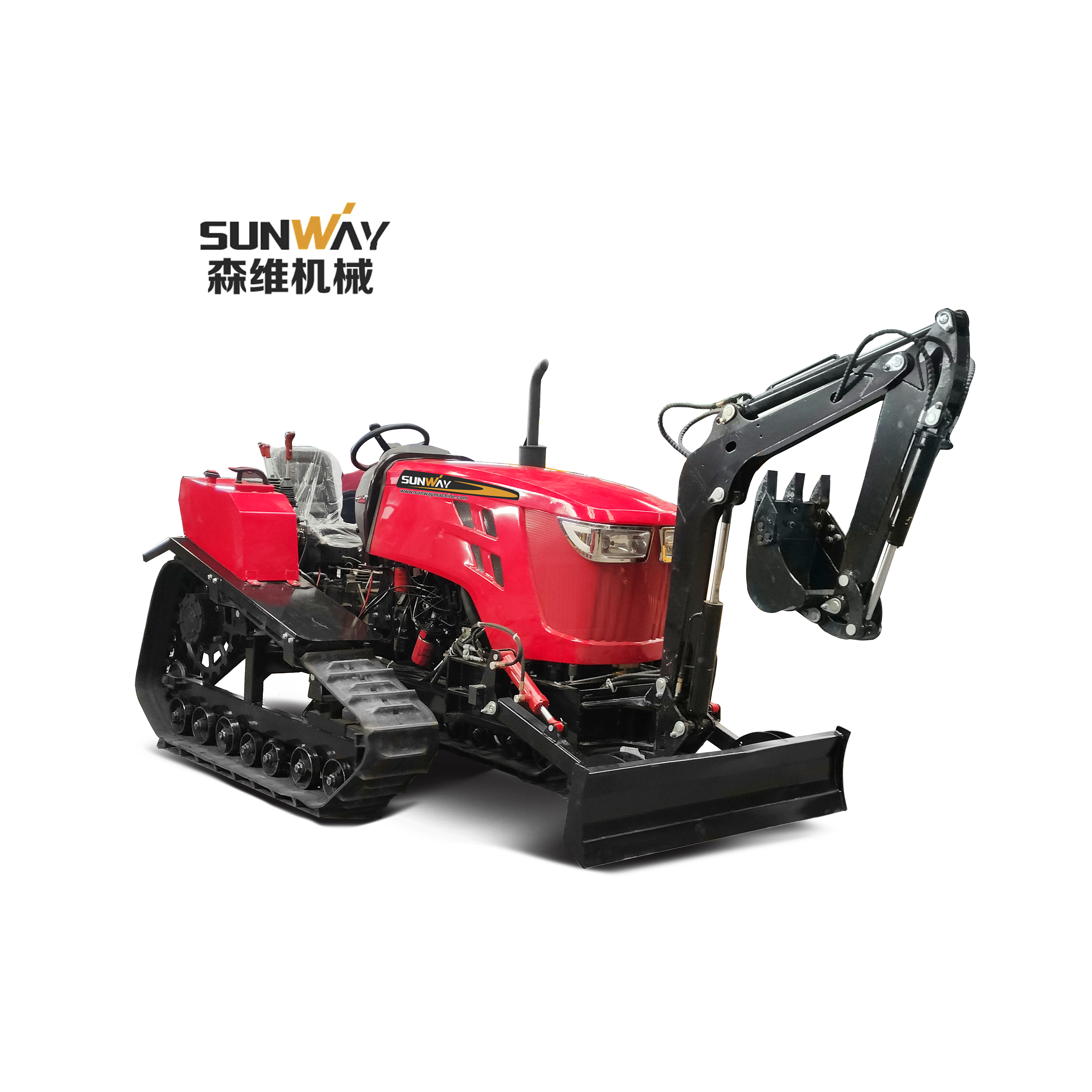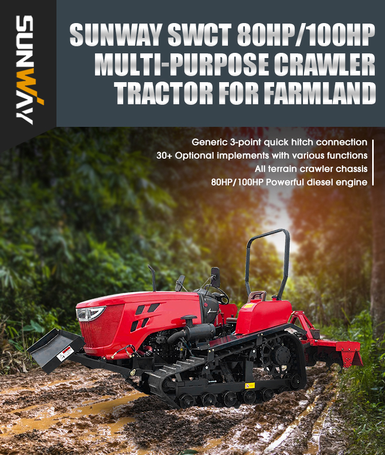 SWCT 80HP/100HP multi-function rubber track crawler tractor is the new generation upgraded agricultural garden farm tractor by SUNWAY technical team after technical improvement, which further strengthens the strength of the tractor body and chassis, ensures the continuous and stable performance output, and optimizes the fuel-saving performance.