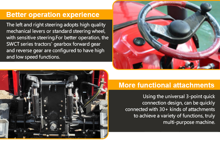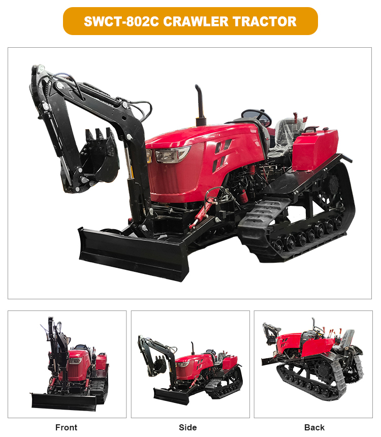 SWCT 80HP/100HP rotary cultivator farm small crawler tractors are provided with rotary plowing, furrowing, weeding, fertilizing, pesticide application, backfilling, ridge and bulldozing with their attachments quick hitched and thus its utilization up greatly. In addition, they are easy to operate and transport.